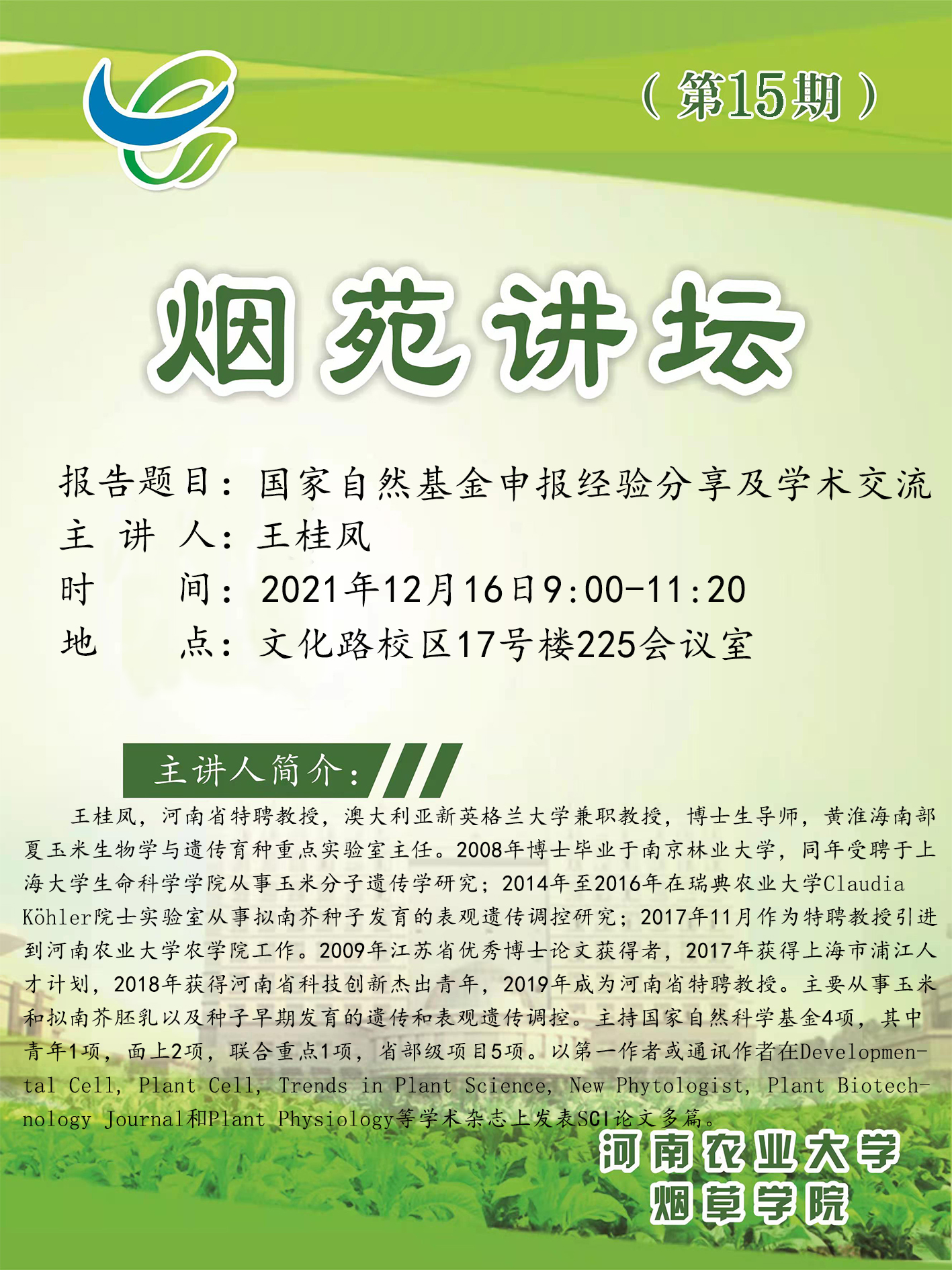 王桂凤,河南省特聘教授,澳大利亚新英格兰大学兼职教授,博士生导师,黄淮海南部夏玉米生物学与遗传育种重点实验室主任。2008年博士毕业于南京林业大学,同年受聘于上海大学生命科学学院从事玉米分子遗传学研究; 2014年至2016年在瑞典农业大学ClaudiaKohler院士实验室从事拟南芥种子发育的表观遗传调控研究; 2017年11月作为特聘教授引进到17吃瓜 农学院工作。2009年江苏省优秀博士论文获得者,2017年获得上海市浦江人才计划,2018年获得河南省科技创新杰出青年,2019年成为河南省特聘教授。主要从事玉米和拟南芥胚乳以及种子早期发育的遗传和表观遗传调控。主持国家自然科学基金4项,其中青年1项,面上2项,联合重点1项,省部级项目5项。以第一作者或通讯作者在Developmental Cell, Plant Cell, Trends in Plant Science, New Phytologist, Plant Biotech-nology Journal和Plant Physiology等学术 杂志上发表SC1论文多篇。