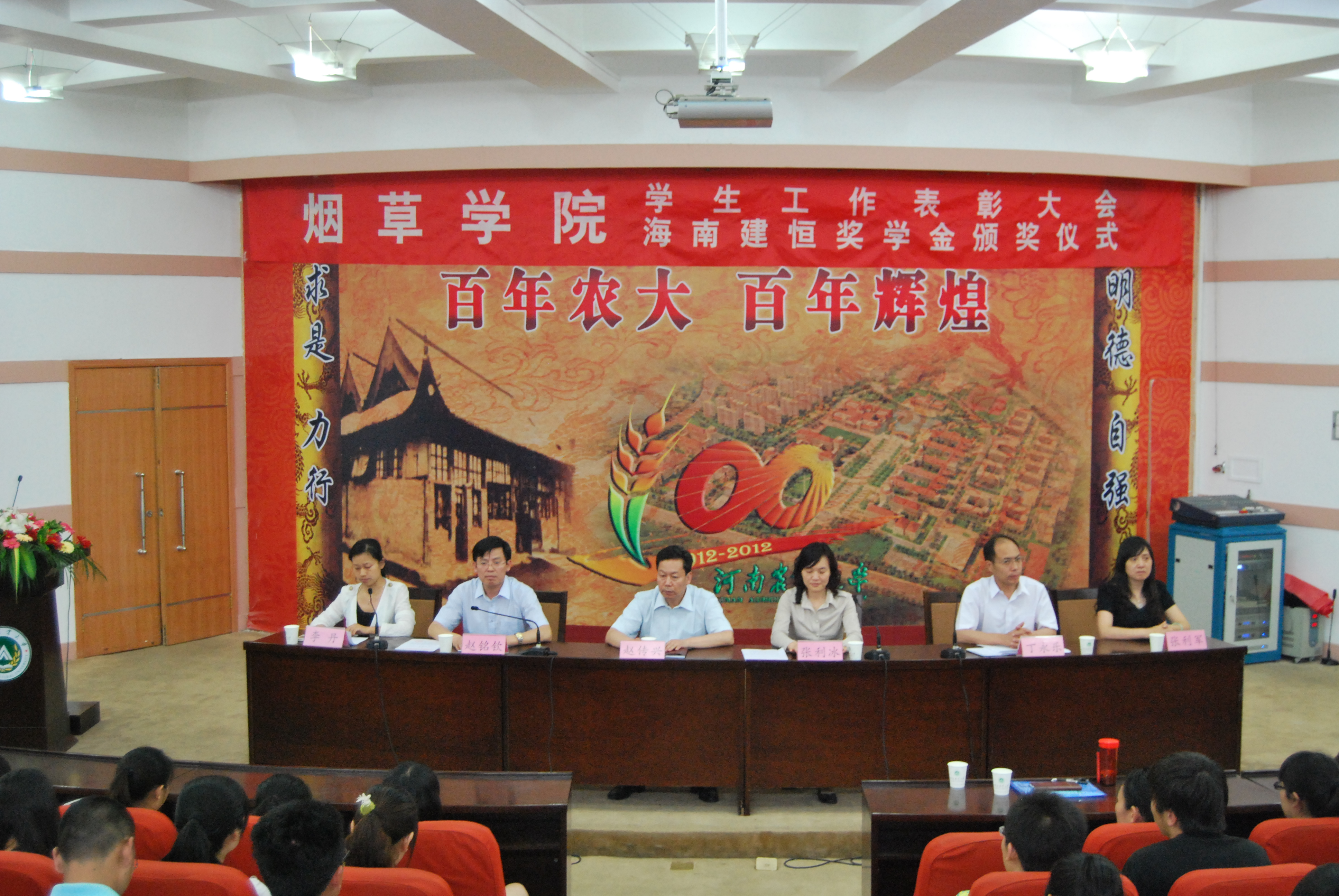 “最佳运动员”和“优秀运动员”的决定》,副院长丁永乐宣读了《关于表彰2011-2012学年先进集体和先进个人的决定》和《关于表彰第二届大学生TIA创新计划优秀项目的决定》。会议表彰了王一丁等10名首届“十佳大学生”和马宏阳等10名“优秀大学生”,同时分别为他们颁发了3000元和2000元的“海南建恒奖学金”;表彰了烟草10-1班等2个先进班集体,烟草10-2班等2个红旗团支部,烟草11-2班学风建设先进集体,田晶晶等32名三好学生,曹宇等40名优秀学生干部,贺帅等40名优秀团员,张秋菊等10名优秀研究生,彭金梅等8名优秀研究生干部,辛静静等5名最佳运动员、周亚军等7名优秀运动员,王艳丽等8个TIA项目计划团队。