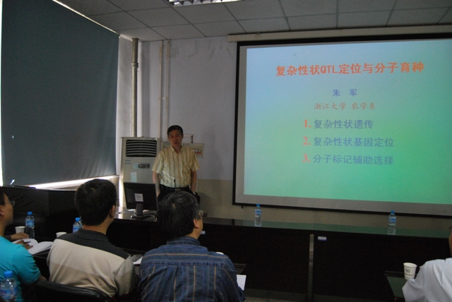 、农学院邀请,来我校访问,为作物学科青年教师和研究生同学作了题为“复杂性状基因定位与分子育种”学术报告。朱军教授从孟德尔性状、复杂性状等两类不同性状的遗传机理入手,介绍了数量性状分析与分子育种的关系;从基因效应大小到分子标记连锁图谱构建、不同特性遗传群体构成,概述了数量性状基因定位的新方法;通过遗传分析全模型及其矩阵表达式的讲解,介绍了统计遗传计算机软件的研发、应用和输出结果的解释;特别以油菜籽油分含量为例,介绍了QTL净遗传效应、特定t时刻的条件遗传效应的基因调控,强调了检测及删除QTL定位异常数据的方法及多目标性状同步改良的意义。此外,还介绍了近年来关于QTL领域的研究成果在分子育种中的应用,建议基于网络资源进行基因信息挖掘。最后,朱军教授还以大量图片展示了浙江大学紫荆港新校区面貌,勉励青年学子到浙大深造。