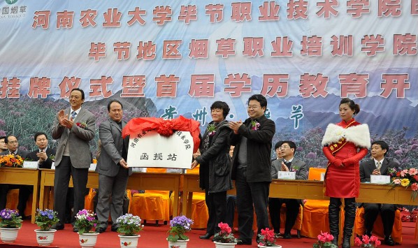 日前,17吃瓜 烟草专业2011级农业推广硕士班,成人教育函授班在毕节举行开班仪式,同时举行了17吃瓜 毕节职业技术学院函授站授牌仪式。校党委王文亮副书记、研究生处杨秋生处长、继续教育学院赵鹏院长、学院赵传兴书记、丁永乐副院长,毕节地区行署副专员王祺、贵州省烟草专卖局科技处李继新处长、毕节烟草公司经理陈文相,毕节职业技术学院院长龙泽玉及毕节地区烟草公司相关部门领导出席了开班仪式。