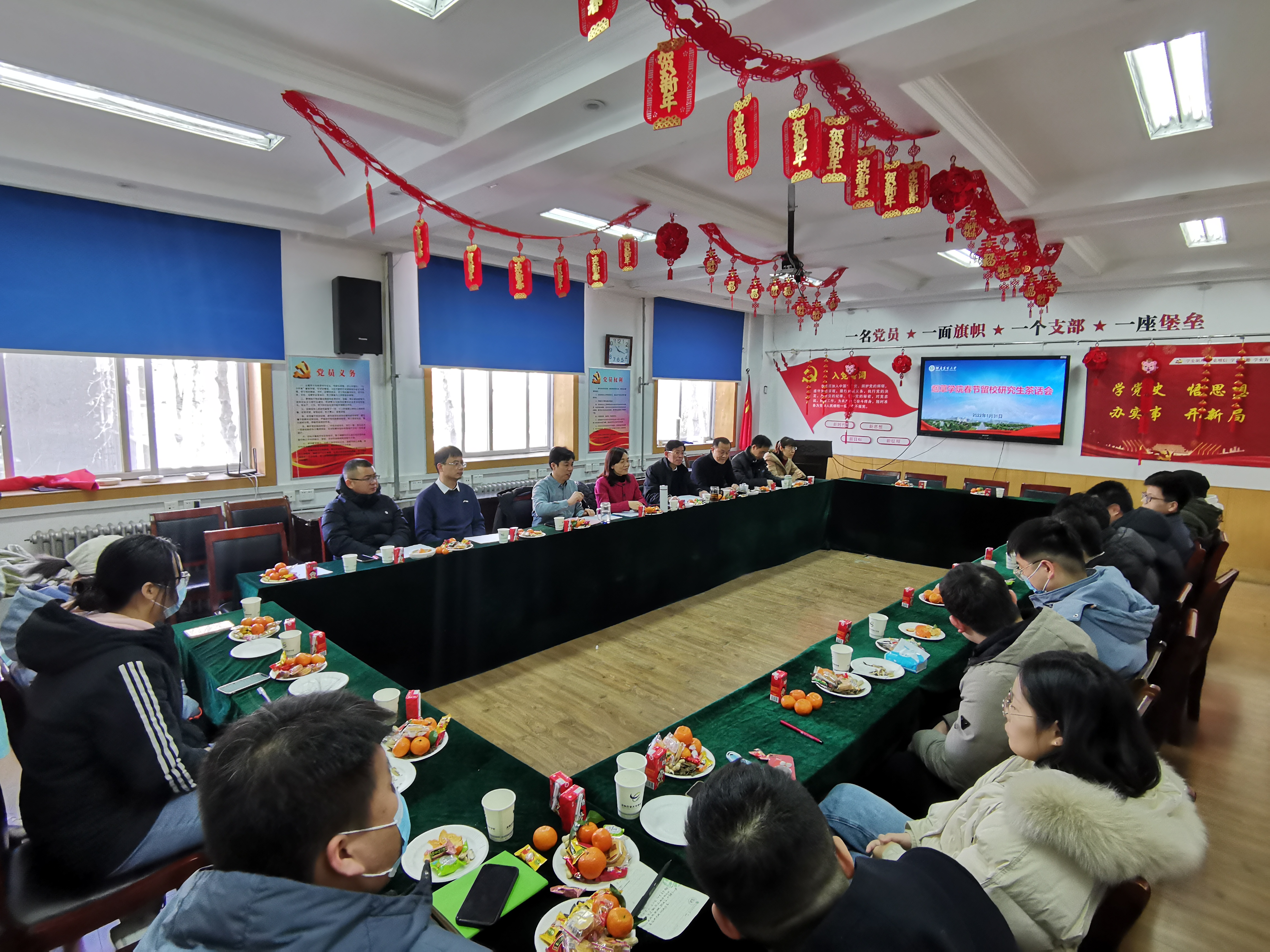 党委书记张利冰、院长赵铭钦、党委副书记史军伟、副院长时向东和宋朝鹏、导师代表、辅导员与春节留校研究生欢聚一堂,会议由史军伟主持。