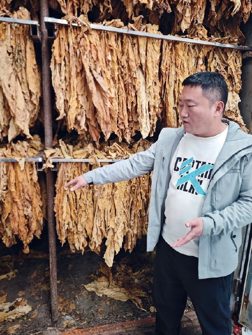合作社的负责人是位“80后”,叫殷阳阳。今年他种植的2000多亩烟叶中,“黑暴现象有一点,比往年多一些。”他拿着一片悬挂着的金黄色烟叶,向记者展示什么样的烟叶是叶片好且烤得好的烟叶。他又指着颜色发暗且比较脆的一片,对比着说:“这样的就有些黑暴,因为雨多了,油分就差,所以就不耐烤,也脆。”