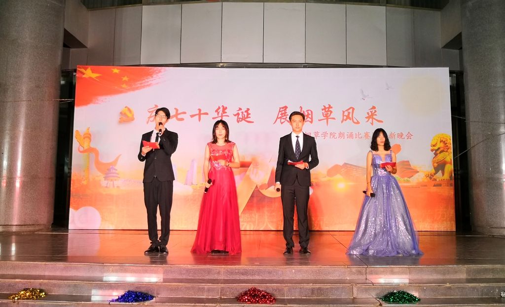 为庆祝新中国70周年华诞,展现烟草学子的风采,同时迎接2019级新生的到来,10月13日晚,17吃瓜 在工程楼南侧举办“庆七十华诞,展烟草风采”朗诵比赛暨2019级迎新晚会。19级辅导员张凯、温心怡,及部分新生助理等人担任评委,19级全体学生观看。
