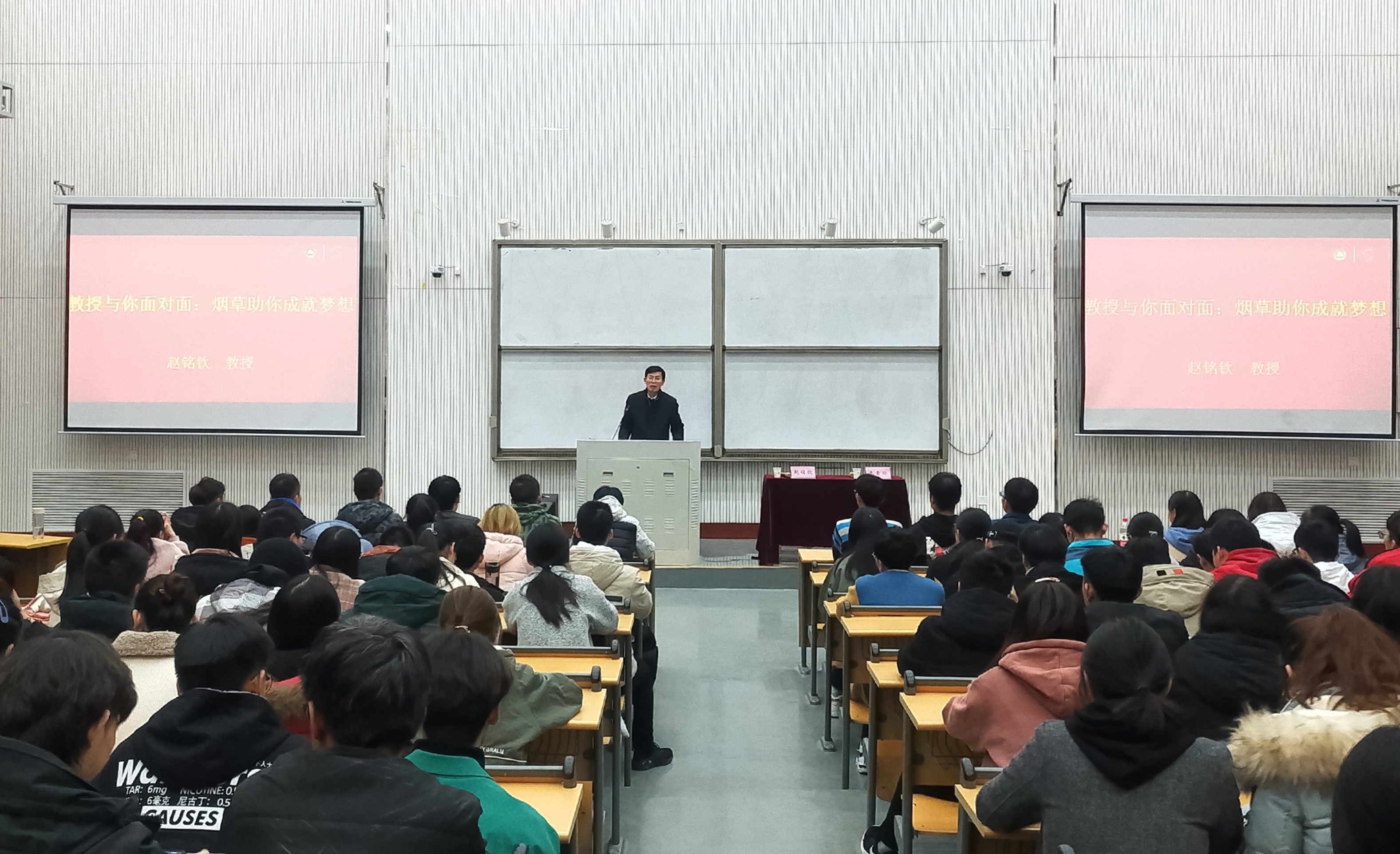 为帮助学生更好的学习烟草专业知识,了解自己的专业就业前景,11月10日晚,17吃瓜 于繁塔楼大教室五举行以“烟草成就梦想”为主题的专题报告会。院长赵铭钦教授主讲,院党委副书记秦素玲主持,19级辅导员张凯、青年教师代表孙聚涛老师、19级全体学生参加此次报告会。