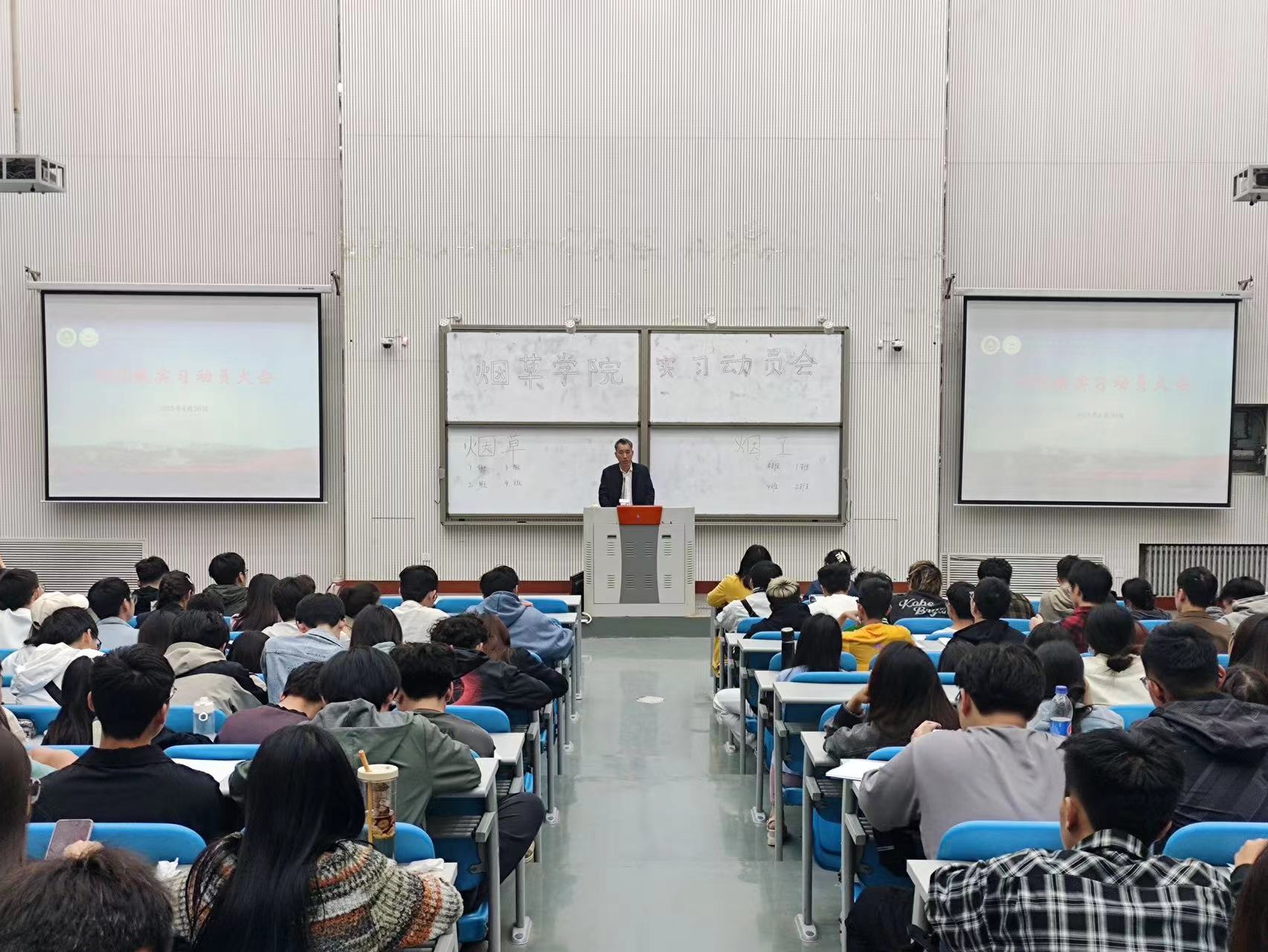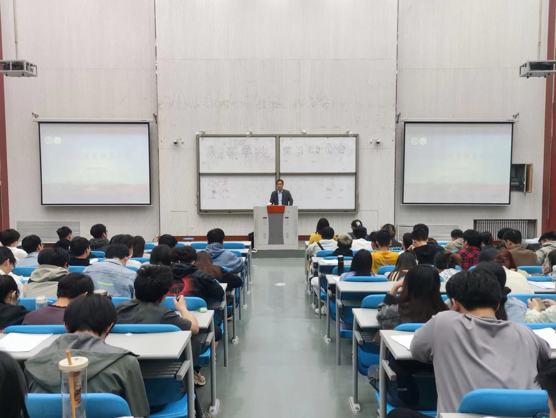 黄五星从实习的目的、要求,内容和注意事项四个方面展开了详细叙述,对烟草专业毕业实习进行了系统安排,强调了实习期间应该注意的若干问题。田斌强就烟工专业学生的毕业实习提出三点希望:一是希望同学们重视实习,珍惜机会,以实习为重,多手准备;二是希望同学们主动对接烟草行业需求,结合所学专业知识,全面提高综合分析问题能力、锻炼独立工作能力,在实习中摆对位置,放平姿态,脚踏实地;三是希望同学们实习过程中保证安全,遵守纪律。王雪婧用几个事例就实习期间加强自我管理和自我约束做出具体要求,强调全体学生要提高人身安全、财务安全和遵纪守法意识,注意防诈骗、防传销,强调了学生自己永远是自己安全的第一责任人。最后,宋朝鹏着重强调了本次实习的重要性,明确指出,本科生产与毕业实习是全面完成专业教学计划的需要,对扎实掌握专业知识、全面提高综合分析问题能力、锻炼独立工作能力具有十分重要的意义。他希望全体学生深入生产一线,努力学习,敢于吃苦,要发扬“明德自强、求是力行”的校训精神,遵从“厚德博学求是笃行”的院训要求,做到理论与实践相结合,切实提高自身专业技能水平。