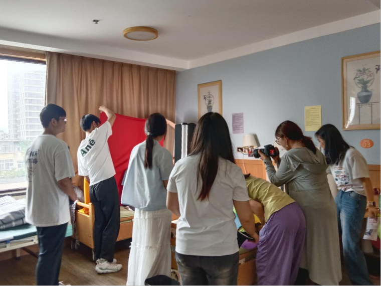 活动中,实践队在养老院活动室搭建了“多彩摄影棚”——以绚丽彩幕作背景,用专业灯光营造温馨氛围。拍摄时,与“岁月讲述者”积极互动,与队伍里的退役士兵和退伍老人聊聊服役片段;为老人别上缀着“好孩子”字样的大红花。面对行动不便的老人,队员们则是携带设备穿梭在楼层间,举起幕布当移动背景,在床边、轮椅旁捕捉鲜活瞬间。给卧床的爷爷奶奶拍摄时,队员在举着补光灯调整角度的同时,也陪老人唠起年轻时的韶华。