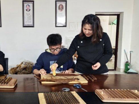 本次专项实践学习以 “聚焦核心工艺、强化技能实操” 为核心导向,紧扣雪茄烟产品设计专业培养要求,重点围绕雪茄烟卷制前处理、茄衣茄胚制作、叶组配方优化及感官质量评价等核心专业内容有序开展。为保障实践学习的专业性和实效性,培训班特别邀请了拥有近 10 年雪茄烟产品设计从业经验的刘晓霞老师担任全程指导教师。本次学习坚持理论与实操结合、讲解与演示同步的形式,针对雪茄烟制作各关键工序开展精细化教学。在茄衣回潮工序中,老师现场演示标准化操作流程,精准讲解并把控温湿度核心参数,着重强调 “回潮程度直接影响茄衣的柔韧性与燃烧性,差之毫厘则谬以千里” 的专业要点;在茄胚制作教学中,采取手把手教学模式,细致教授卷制手法、力度控制等实操技巧,对学员操作中的不规范之处逐一纠正、现场指导;针对茄衣使用全流程,从茄衣的筛选、裁剪到贴合方式等细节环节,进行了细致入微的拆解讲解。